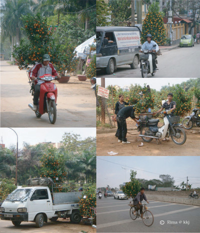 テトの期間は久しぶりに普段の喧騒から逃れることが出来ます。家々の軒先には国旗が揚げられ、金柑や桃の木が門松のように飾られます。