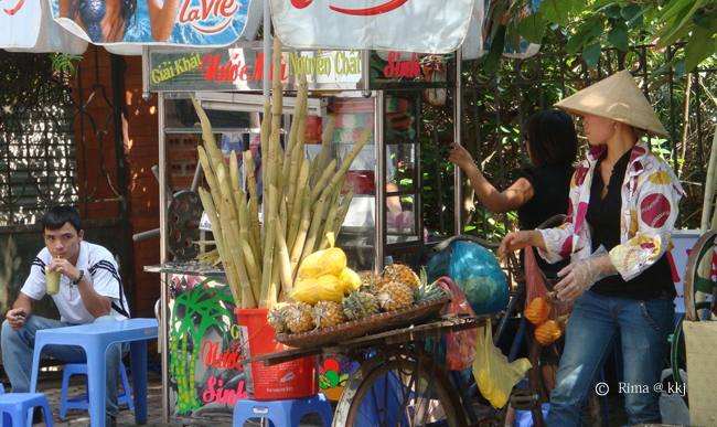 寒さが和らいでくると、旬のフルーツを籠に山ほど積んで売り歩く移動式果物屋さんの登場です。南部から来るものが殆どですが、マンゴスチン、ライチー、ドラゴンフルーツ、スイカ、パイナップル、マンゴ-、etc。