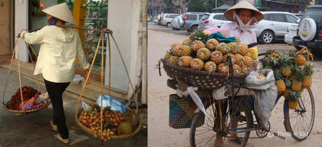 寒さが和らいでくると、旬のフルーツを籠に山ほど積んで売り歩く移動式果物屋さんの登場です。南部から来るものが殆どですが、マンゴスチン、ライチー、ドラゴンフルーツ、スイカ、パイナップル、マンゴ-、etc。