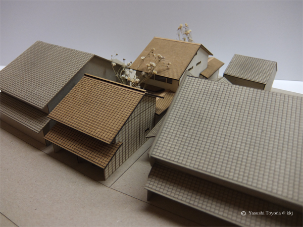 隣家は、ご覧の通り立派な伝統建築です。その間に建てるということもあり、従前の建物の規模を踏襲しつつ、コの字型平面とすることにより屋根を分節し、周囲の建物の高さを超えないように配慮しました。