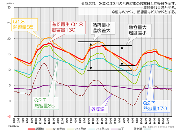 名古屋市の最寒日の前後3日間の外気温を元に、室温がどのくらいになるのかシミュレーションしました。本建物は、Q値1.8W/㎡K、熱容量130KJ/㎡Kです。その他、Q値と熱容量を上下させて、4種類の建物の性能値を比較しています。結果は、熱容量が大きいと、温度差が小さくなるので、土壁効果が発揮できています。
