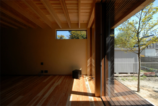 サンルームは、トップライトがあるので集熱量が多く、温度・湿度の変動が大きくなるため、その変動効果を利用し、冬期の熱と水蒸気を室内に取り込みます。正面小窓の左手にセンサー付きの換気装置を設けて、熱と水蒸気を室内の寝室へ配り、室温上昇と加湿を試みます。