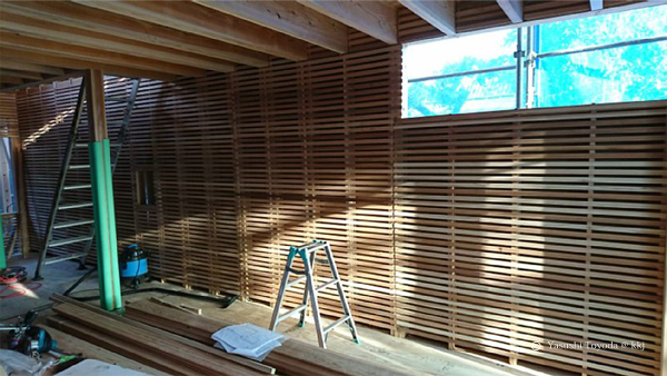 土壁は、木小舞下地です。木と木の隙間は約21mmあいています。見た目は、木摺ですが、木摺と説明してしまうと、木と木の隙間を6mmぐらいとして仕上られてしまうので、木小舞という呼び名にしています。写真を見てもわかるように木小舞が張られた瞬間が一番綺麗かもしれません。木小舞背面は、塞がっているように見えますが、雨養生のため仮止めをしています。土壁が乾燥した後、羊毛断熱材を充填し、面材で塞ぎます。