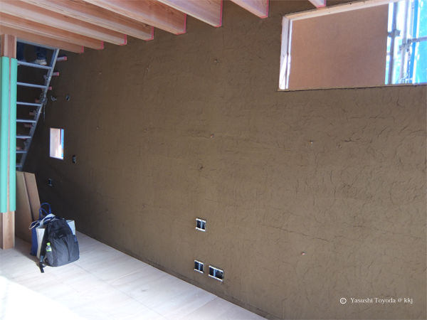 荒土塗りです。今回は、名古屋という土地柄もあり、工務店さんの左官屋さんにお願いしました。発酵させた豊田の荒土を使われています。