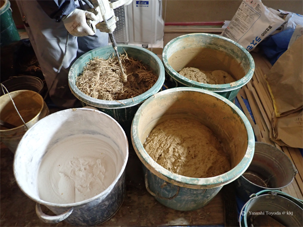 荒土塗り、中塗りと終わり、次は仕上です。左官屋さんの作業場へ見学に行った際、置いてあったサンプルをみて、LDKの壁は、豊田土半田なできり仕上に決まりました!半田は、土と石灰を半分ずつ混ぜあわせることから、半田と言われています。今回は、豊田土にヒダシスサと石灰、砂を混ぜてつくっています。