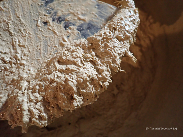 豊田土半田なできり仕上のアップ写真は、グレーっぽい色目ですが、遠目で見ると、茶色系です。木部の色目と調和が取れて、とても穏やかです。
