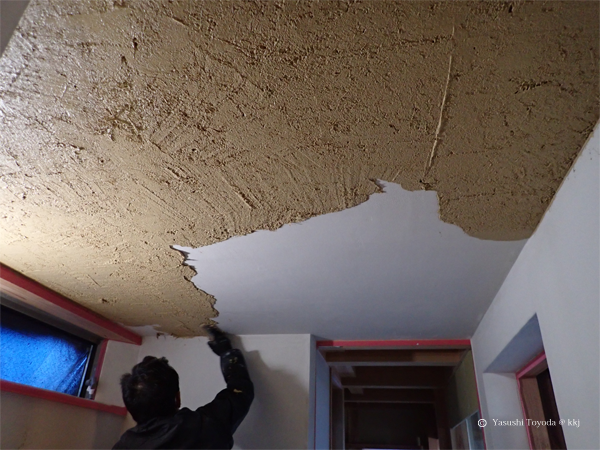 半田を天井に塗ります。土を天井に塗れるのか?すぐに剥がれてくるのでは?と心配になる方もいますが、問題ありません。石膏ボードに白い下塗材を塗り、半田を塗ります。