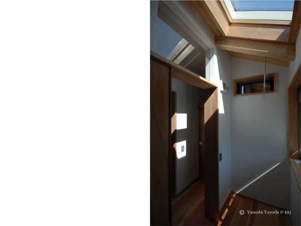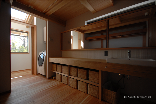 こちらは、洗面室です。奥に洗濯室とサンルームがあります。サンルームは断熱・防湿区画を行い、トップライトを設けてパッシブゾーンとしました。