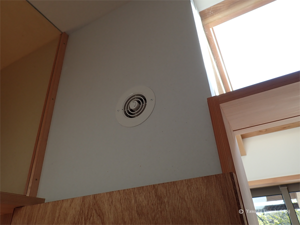 ある一定の温度になると換気扇が動きだし、この吹き出し口から熱と水蒸気が室内へ排出されます。日中の不在時に寝室の土壁に蓄熱・蓄湿してくれる計画です。私はこれを土パッシブ暖房と呼んでいます。簡易的なものなので、やんわり効いてくれればいいなと思っています。