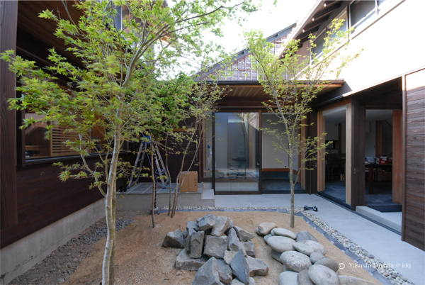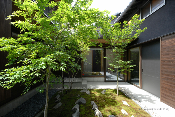 次にお庭です。コの字型の平面計画ですので、庭師さんに中庭をしつらえてもらいました。庭師さんのデザインセンスを知っていたので、私はほとんど口出しせず、全てお任せしました。苔をお願いしますと伝えたぐらいです。