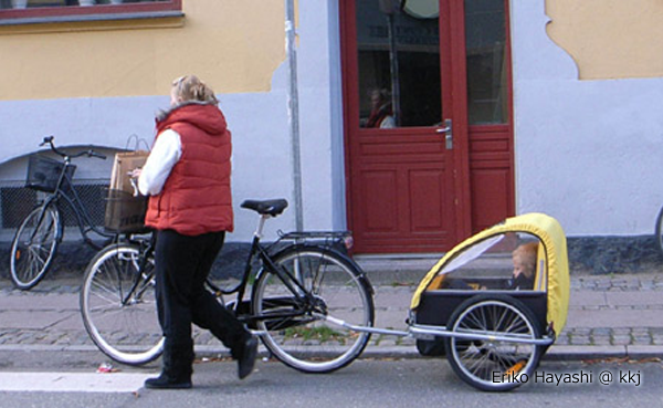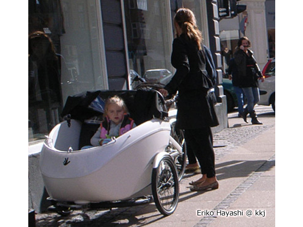 自転車のワゴンに入っているデンマークの子供達。コペンハーゲンの街に、微笑ましい雰囲気を与えます。