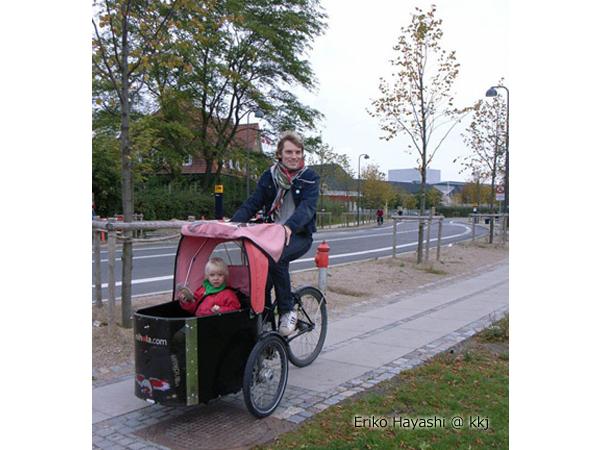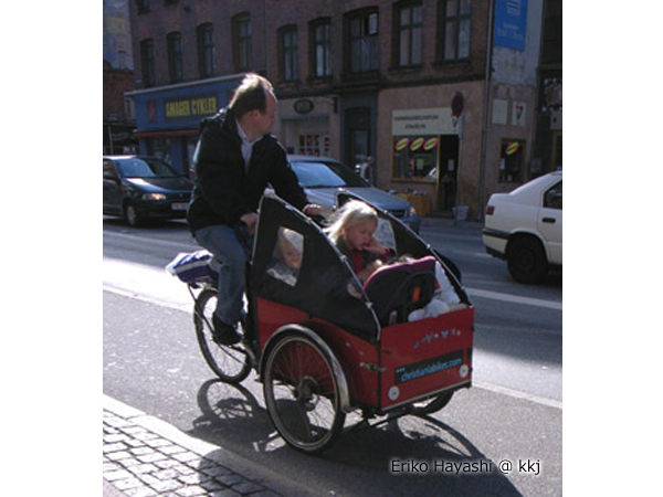 特に街を走っていてよく目にするのが、子供を乗せて保育園や幼稚園に行くお父さんやお母さんの姿。ほとんどが共働きのデンマーク人、朝の自転車ラッシュのなか、自転車に揺られてゆく子供達。ですから、自転車の形も工夫されています。