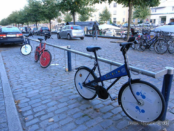 コペンハーゲンの街の中には、観光客用の自転車スタンドが街の要所、要所に配置されています。自転車に20クローネコインを入れると、鍵がはずれます。同じ場所のスタンドに返さなくても、どこかのスタンドにまた鍵をかけて返すと、20クローネコインが手元に戻ってくるシステム。なかなか良いアイデアです。