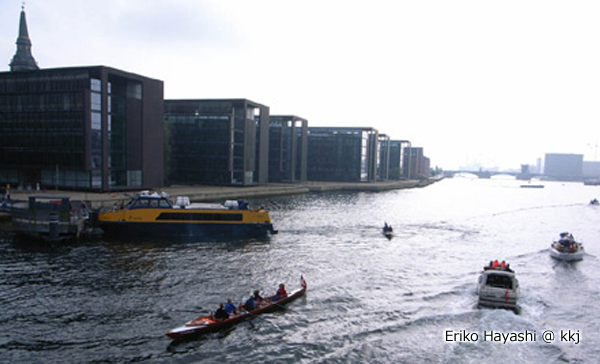 コペンハーゲンの街を通っているハーバー。黄色い船は水上バス。このバスにも自転車を乗せることができます。