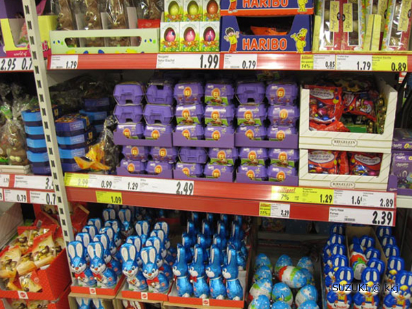 クリスマスのお菓子が店頭から姿を消すと間もなく卵やウサギを象ったチョコレートが並び始めます。ヴァレンタインデーのチョコレート・・・を贈る習慣はありません。このお菓子たちはもうすぐやってくるイースターのお祭り用です。