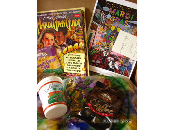 カーニバル最終日の火曜日はマルディ・グラ(肥沃な火曜日)とよばれ特に盛大なお祭りが開催されます。このお祭りがさかんなアメリカのニューオーリンズ出身の友人の元にはこの日のために小包が届いていました。