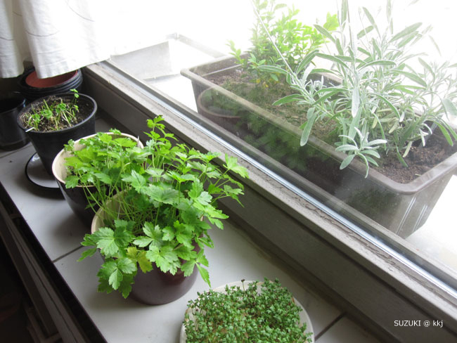 キッチンの出窓で小さな家庭菜園コーナーをかまえ、少しずつ摘んで食します。