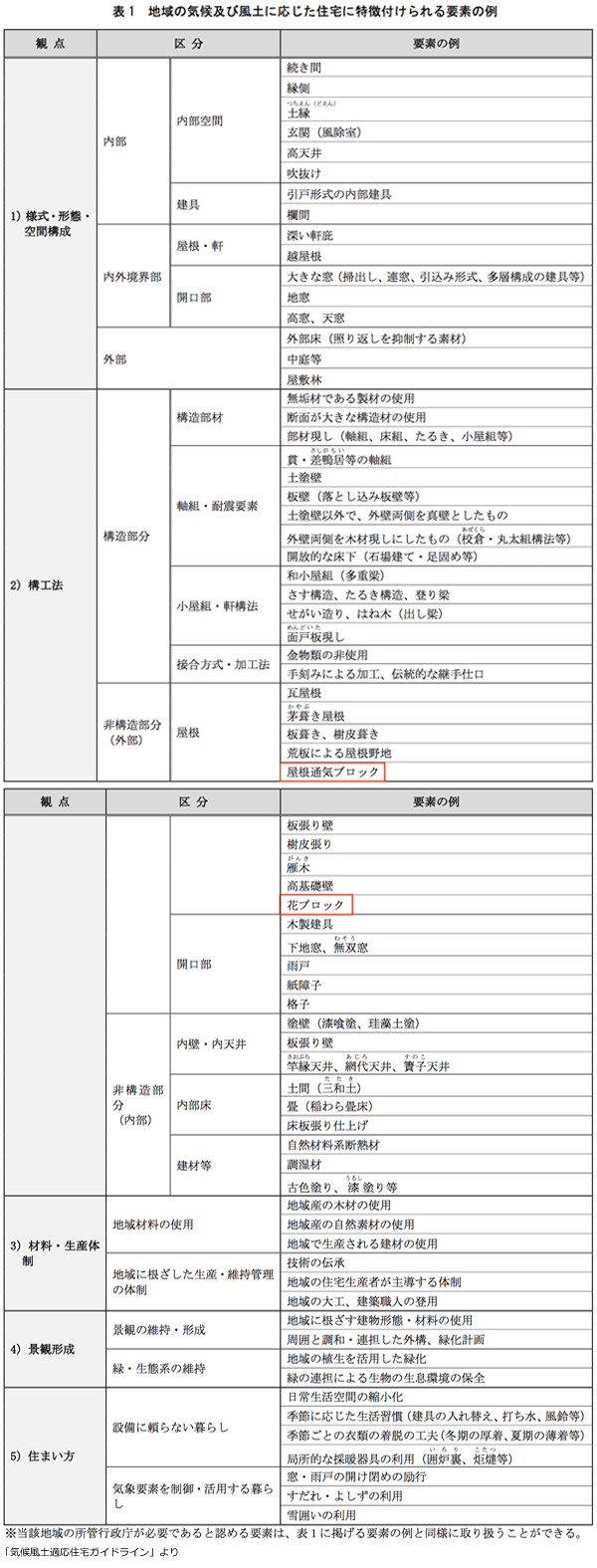 地域の気候及び風土に応じた住宅に特徴付けられる要素の例の表があり、その中に伝統木造の要素に混じって「屋根通気ブロック」「花ブロック」と記載されていたからです。